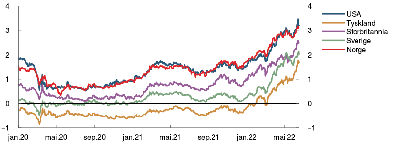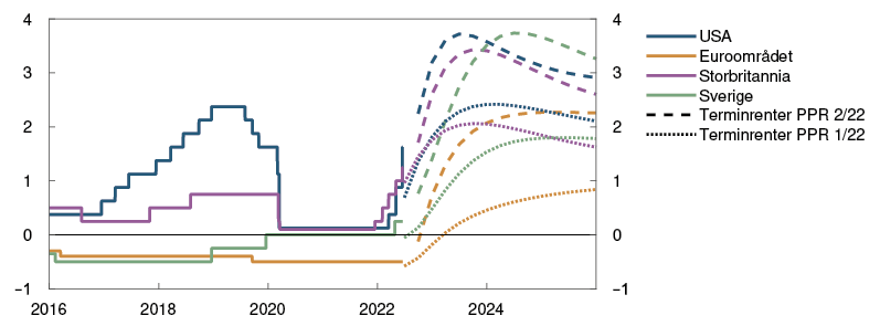 Raskt stigende inflasjon og bekymring for at pris- og lønnsveksten kan holde seg høy også fremover, har ført til at sentralbankene har strammet til pengepolitikken mer enn markedsaktørene så for seg i mars. Siden forrige rapport har sentralbankene i USA og Storbritannia hevet styringsrenten med henholdsvis 1,25 og 0,75 prosentenheter til 1,5 og 1,25 prosent. I Sverige har sentralbanken hevet styringsrenten fra 0 til 0,25 prosent, mens den europeiske sentralbanken har signalisert at første renteøkning kommer i juli. Sentralbankene signaliserer ytterligere tilstramminger fremover, og markedsprisingen viser at styringsrenteforventningene har steget markert siden forrige rapport. Langsiktige statsrenter har i hovedsak fulgt utviklingen i styringsrenteforventningene.