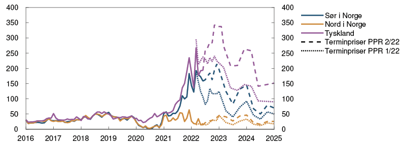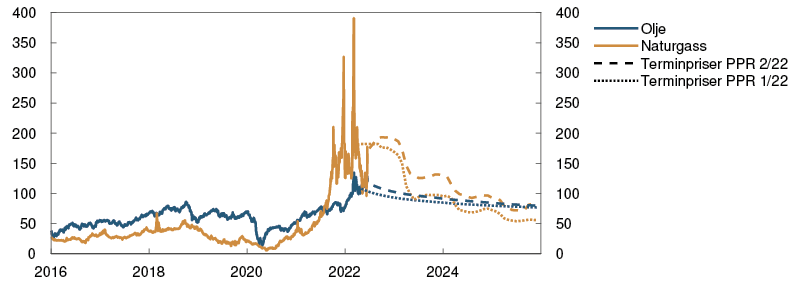 Prisen på olje har steget med om lag 5 prosent siden rapporten i mars og er nå rundt 120 dollar per fat, se figur 1.A. Oppgangen skyldes særlig redusert eksport av russisk olje. Frigivelse av strategiske oljelagre fra flere land og smitteverntiltak i Kina har begrenset prisoppgangen. Landene i OPEC-pluss har besluttet å fremskynde produksjonsøkninger, men det er trolig ikke nok til å erstatte bortfallet av russisk olje. OPECs ledige produksjonskapasitet er liten, og oljelagrene i OECD-landene er lave. Globalt oljeforbruk kan fortsette gjeninnhentingen etter koronapandemien. Fremtidsprisene indikerer lavere oljepris de kommende årene. Fremtidsprisene for 2025 er likevel over 80 dollar per fat, som er høyere enn de var ved forrige rapport, se tabell 1.A.