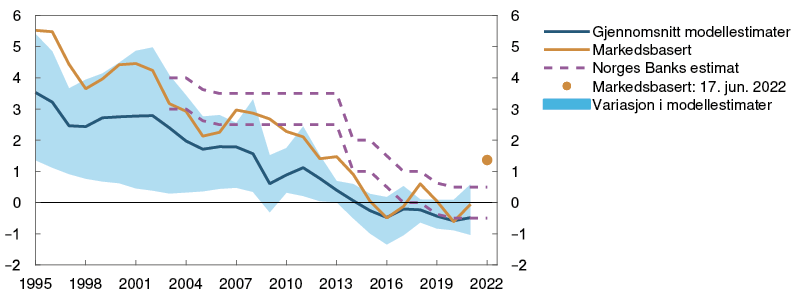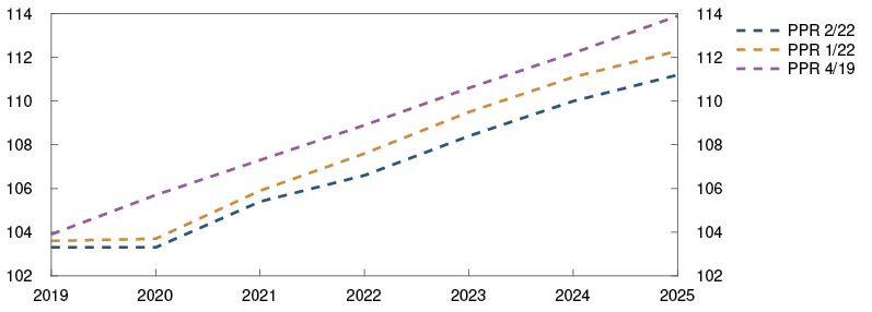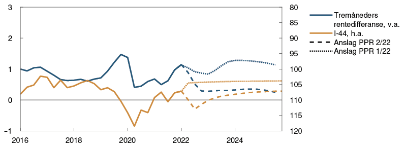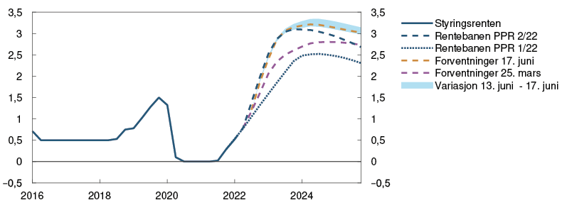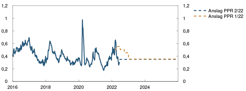 2 Periode: 1. januar 2016 – 31. desember 2025. Dagstall til og med 17. juni 2022. Kvartalstall fra 2. kv. 2022 for PPR 1/22 og 3. kv. 2022 for PPR 2/22. Terminrenter per 18. mars 2022 for PPR 1/22 og 17. juni 2022 for PPR 2/22. For euroområdet vises ESBs innskuddsrente.
