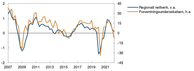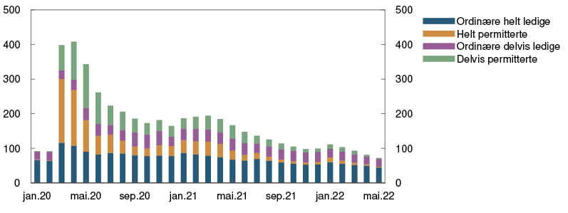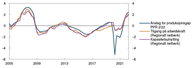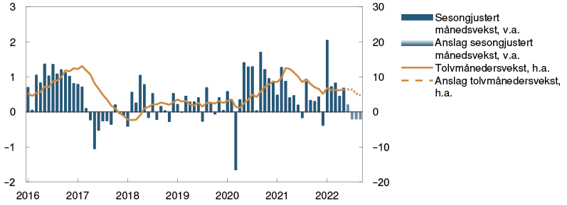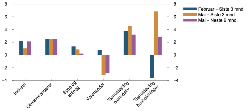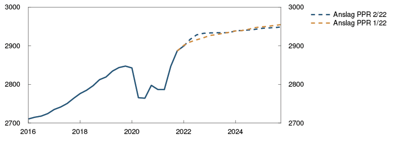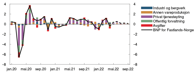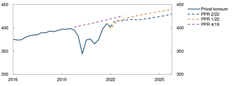 Den økonomiske aktiviteten har tatt seg raskt opp etter at omikronbølgen førte til en nedgang i vinter. BNP for Fastlands-Norge var i april litt lavere enn anslått i forrige rapport. Samtidig var det sterk vekst i de næringene som hadde vært rammet av smitteverntiltak. Husholdningenes konsum har steget videre og vært litt høyere enn anslått. Kjøp av tjenester tok seg raskt opp gjennom våren og er nå tilbake på nivåene fra før 2020. Samtidig har etterspørselen etter varer vært høyere enn ventet.