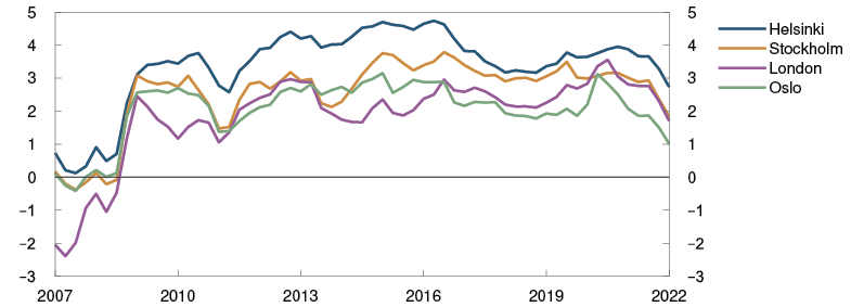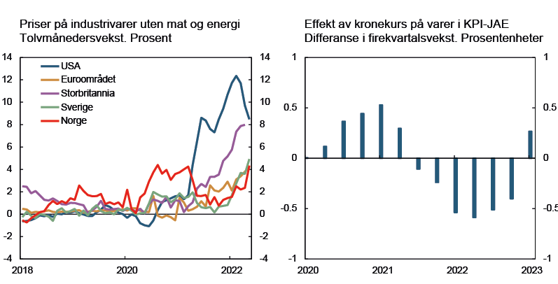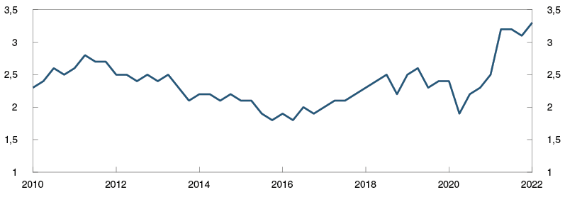 Høye energipriser og kombinasjonen av høy etterspørsel og begrensninger på tilbudssiden har ført til en betydelig oppgang i konsumprisveksten internasjonalt. Siden mars har den underliggende prisveksten hos handelspartnerne steget mer enn anslått. Den høye prisveksten er bredt basert, og i flere land er det høy prisvekst på både varer og tjenester. Krigen i Ukraina bidrar til at energi- og matvareprisene holder seg høye. Oljeprisen har steget videre, mens spotprisen på gass er lite endret. Prisene på leveranser av olje og gass lenger frem i tid er høyere enn i mars. Fraktratene fra Kina til Europa har avtatt.