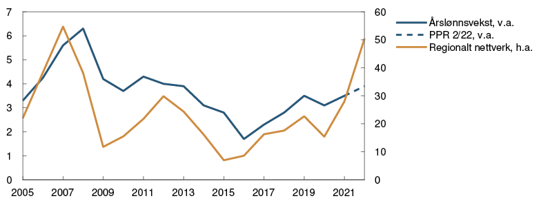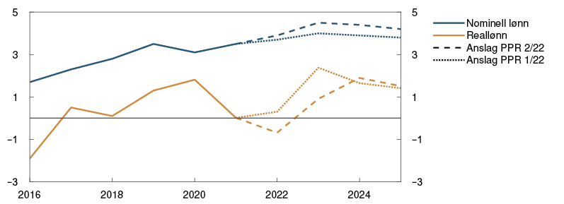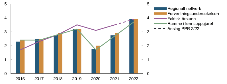 Årets lønnsoppgjør ser så langt ut til å være forenlig med anslaget på årslønnsveksten i forrige rapport. Et stramt arbeidsmarked kan likevel føre til at lønnsveksten fremover vil stige noe mer enn tidligere anslått. Årslønnsveksten i 2022 anslås nå til 3,9 prosent, som er høyere enn i forrige rapport. Lønnsanslaget er på linje med lønnsforventningene til partene i arbeidslivet og til bedriftene i vårt regionale nettverk.
