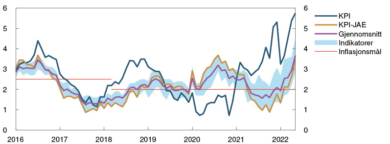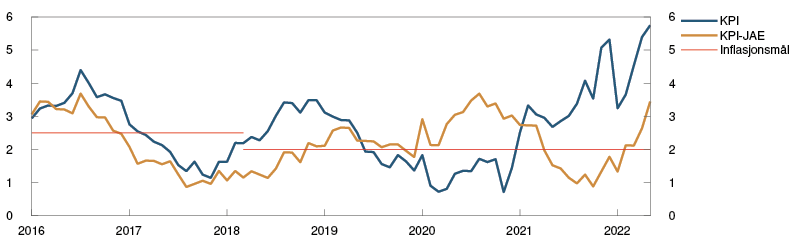 5 Periode: Januar 2016 – mai 2022. KPI-JAE: KPI justert for avgiftsendringer og uten energivarer.
