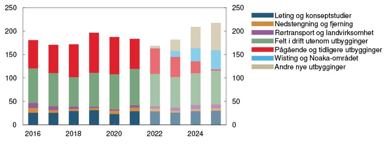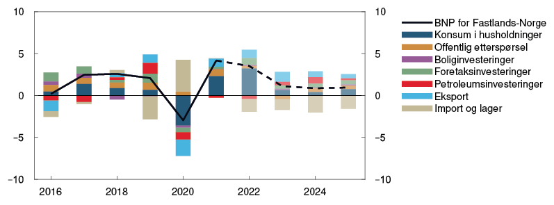Etter en periode med en rask gjeninnhenting etter pandemien, har aktiviteten i norsk økonomi kommet opp på et høyt nivå. Det er utsikter til at veksten avtar noe fremover. Høyere prisvekst og økte renter vil trolig dempe veksten i husholdningenes konsum de neste årene. Samtidig venter vi at god vekst i petroleumsinvesteringene og foretaksinvesteringene vil bidra til å løfte aktiviteten.