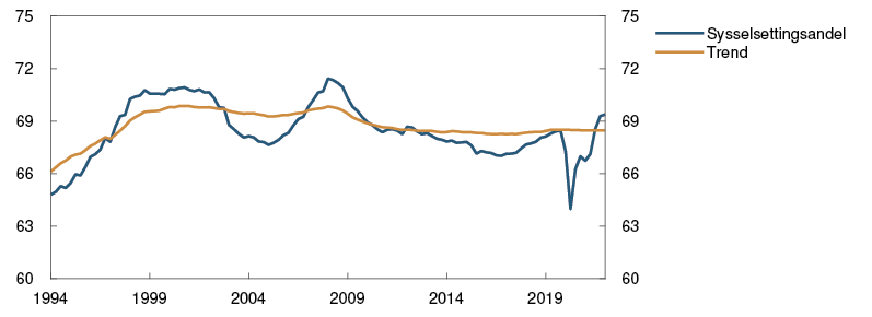 Sysselsettingen har fortsatt å stige, og arbeidsmarkedet er stramt. Bedriftene i vårt regionale nettverk rapporterte i mai om økende problemer med tilgang på arbeidskraft og innsatsvarer. Bedriftene så for seg at veksten i aktiviteten ville avta noe det neste halve året, og mange pekte på kapasitetsproblemer som årsak til avdempingen. Andelen av bedriftene som meldte om kapasitetsproblemer og at mangel på arbeidskraft begrenser produksjonen, er nå like høy som under høykonjunkturen før finanskrisen. Et høyt antall ubesatte stillinger bekrefter at det er stor etterspørsel etter arbeidskraft. Den sesongjusterte registrerte arbeidsledigheten falt til 1,7 prosent i mai, som er lavere enn anslått i forrige rapport.