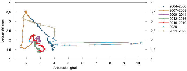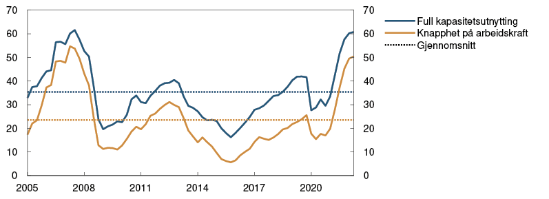 4 Periode: 1. kv. 2005 – 2. kv. 2022. Andel av kontaktene som vil ha noen eller betydelige problemer med å møte vekst i etterspørselen og andel av kontaktene som svarer at knapphet på arbeidskraft begrenser produksjonen. Spørsmålet om arbeidskraft er bare stilt til de bedriftene som har oppgitt å ha full kapasitetsutnytting, men serien viser andelen av alle kontaktene i intervjurunden. Kommune- og sykehussektoren svarer ikke på spørsmålet om kapasitetsutnytting, men svarer på spørsmålet om arbeidskraft.