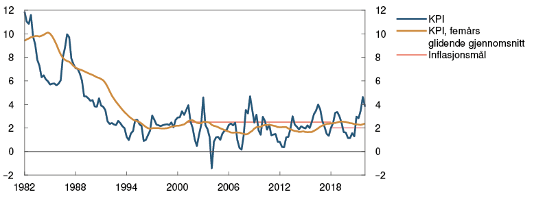 Prisveksten her hjemme har steget videre. Tolvmånedersveksten i konsumprisindeksen justert for avgiftsendringer og uten energivarer (KPI-JAE) steg til 3,4 prosent i mai, som var høyere enn anslått. Oppgangen ser ut til å være bredt basert. Prisene både på varene vi importerer og på norskproduserte varer og tjenester har steget mer enn anslått. Lønnsveksten er på vei opp, og produsentprisene på varene vi importerer har økt mer enn ventet. Sammen med svekkelsen av kronen vil det bidra til å løfte prisveksten fremover.