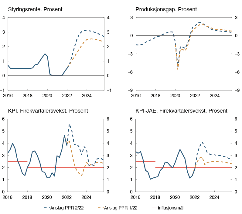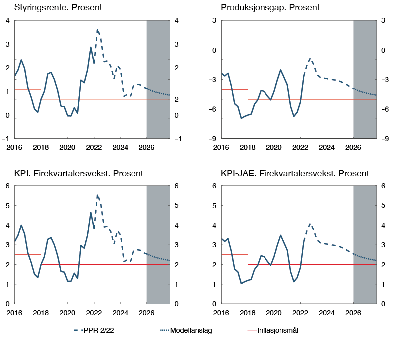 6 Periode: 1. kv. 2016 – 4. kv. 2025. Anslag fra 1. kv. 2022 for PPR 1/22 og 2. kv. 2022 for PPR 2/22 for styringsrente, KPI og KPI-JAE. Produksjonsgapet måler den prosentvise forskjellen mellom BNP for Fastlands-Norge og anslått potensielt BNP for Fastlands-Norge. KPI-JAE: KPI justert for avgiftsendringer og uten energivarer.