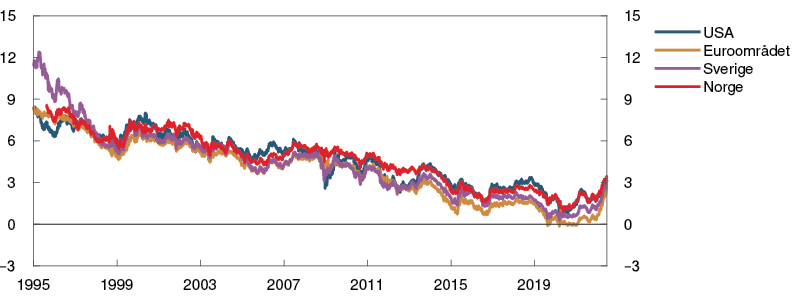 Figur 1.5 Langsiktige renter har økt5 Renter på tiårs statsobligasjoner i utvalgte land. Prosent