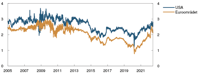 Lønnsveksten hos handelspartnerne har vært høyere enn anslått i forrige rapport. Etterspørselen etter arbeidskraft er høy, og antall ledige stillinger har økt markert. Arbeidsledigheten er i flere land nede på nivåene fra før pandemien. Anslagene for lønnsveksten hos handelspartnerne de neste årene er oppjustert. Langsiktige markedsbaserte inflasjonsforventninger i USA er lite endret siden marsrapporten, mens de har falt noe i euroområdet. De ligger nær inflasjonsmålene både i USA og euroområdet. Vi venter at den underliggende konsumprisveksten i år blir nær 6 prosent i USA og rundt 3,5 prosent i euroområdet. Vi anslår at den underliggende prisveksten for handelspartnerne samlet vil avta til 3 prosent i 2023, før den gradvis reduseres til 2 prosent. Anslagene i 2022 og 2023 er oppjustert fra marsrapporten.