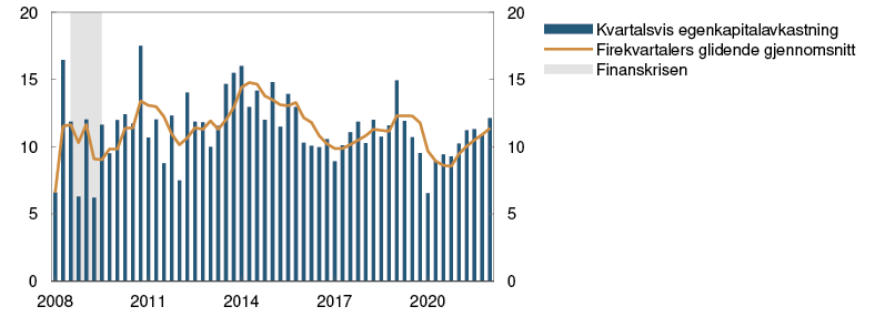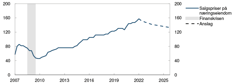 Veksten i kreditt og eiendomspriser avtok i løpet av fjoråret etter å ha vært høy under koronapandemien. I år har boligprisveksten igjen tiltatt, men veksten ventes å avta fremover. Veksten i næringseiendomsprisene har også tiltatt den siste tiden, men vi venter at prisene avtar noe fremover som følge av gradvis økende avkastningskrav. Avkastningskravet er imidlertid lavt, og en brå økning kan føre til et mer markert prisfall. Samlet sett er vurderingen av syklisk sårbarhet om lag som før pandemien.