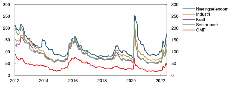 Usikkerhet om de globale vekst- og inflasjonsutsiktene har bidratt til store svingninger i finansmarkedene. Styringsrenteforventningene internasjonalt har steget mye siden forrige rapport. I flere land har sentralbankene hevet styringsrentene for å dempe prisveksten, og mange har signalisert raskere renteoppgang fremover. Langsiktige renter har også steget siden mars. Kredittpåslagene på foretaksobligasjoner har økt, og internasjonale aksjeindekser har falt.