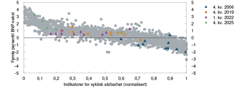 Usikkerhet om de globale vekst- og inflasjonsutsiktene har bidratt til store svingninger i finansmarkedene den siste tiden. Dersom risikopremier ute øker brått og formuespriser faller markert, kan det også påvirke det norske finansielle systemet. Sårbarheter i det finansielle systemet kan føre til at slike forstyrrelser får større konsekvenser for norsk økonomi.