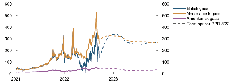 Den europeiske gassprisen er nå rundt 250 dollar per fat, regnet i oljeekvivalenter. Det er betydelig høyere enn i juni, se figur 1 A.1 Oppgangen skyldes i stor grad at Russland har stoppet gassleveranser til flere europeiske land. Etterspørselen etter gass har blitt holdt oppe som følge av at varmt, tørt og stille vær har redusert annen kraftproduksjon, samtidig som kraftforbruket til avkjøling har økt. EU-landene har i tillegg kjøpt inn mye gass for å fylle gasslagre før vintersesongen. Dersom russisk gasseksport forblir på dagens lave nivåer, vil gasslagrene kunne reduseres mye i løpet av vinteren, spesielt dersom det blir kaldt. Fremtidsprisene indikerer at gassprisene kan bli høye gjennom vinteren, for deretter å falle noe utover i tid. Fremtidsprisene for gass er likevel mye høyere enn de var ved junirapporten, se tabell 1.A.