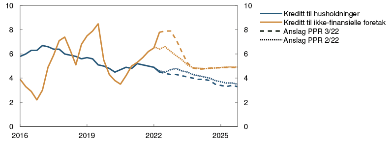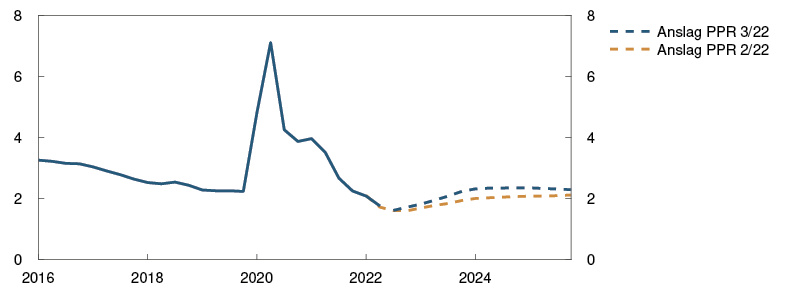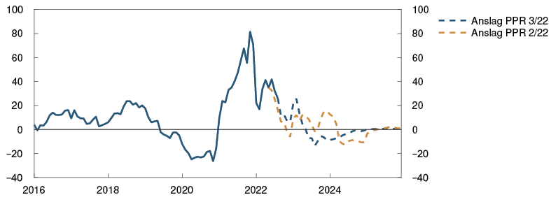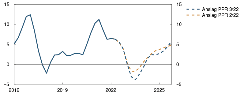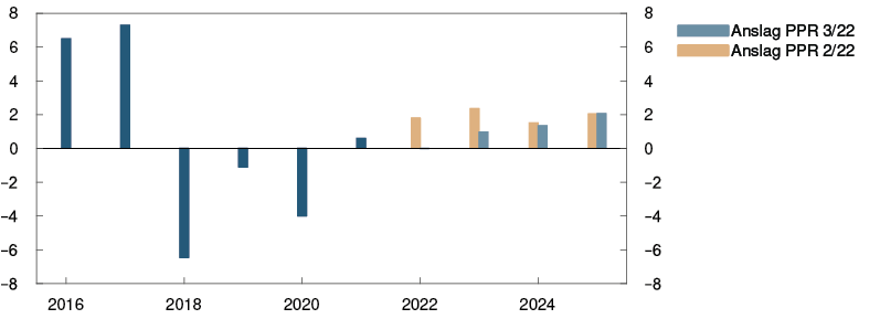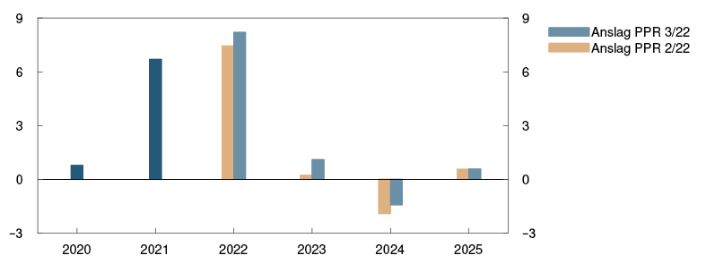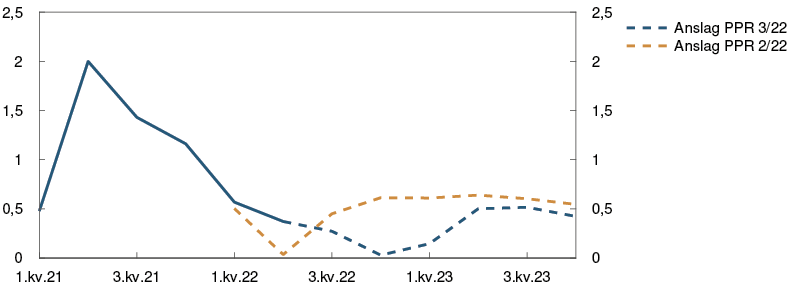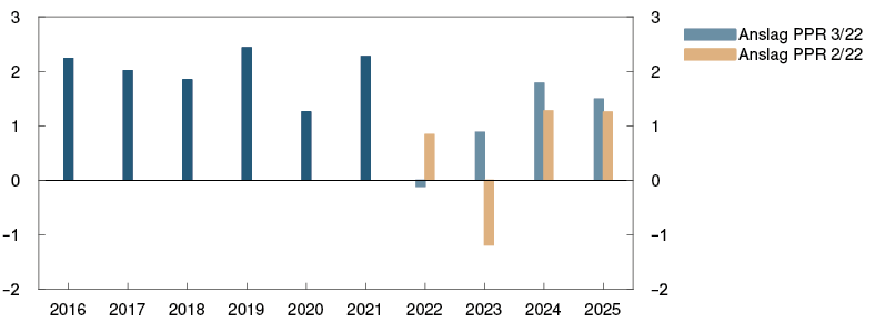 Prosentvis endring i anslag fra Pengepolitisk rapport 2/22 i parentes |