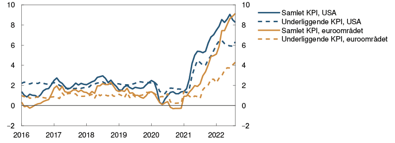 Pandemirelaterte forhold både på tilbuds- og etterspørselssiden og krigen i Ukraina har bidratt til markert oppgang i inflasjonen hos viktige handelspartnere siden i fjor høst. Tolvmånedersveksten i konsumprisindeksen var om lag 9 prosent i euroområdet og litt over 8 prosent i USA i august, se figur 1.3. Veksten i prisene på energi og mat bidro til over halvparten av tolvmånedersveksten i euroområdet, og den underliggende konsumprisveksten var 4,3 prosent i august. I USA var den underliggende konsumprisveksten 6,3 prosent i august. De siste månedene har den underliggende prisveksten hos handelspartnerne vært høyere enn anslått i forrige rapport, særlig i USA og Sverige.