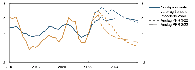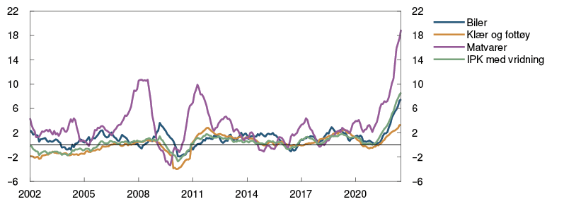 Veksten i produsentprisene på konsumvarer som Norge importerer (IPK), målt i utenlandsk valuta, har vært høyere enn ventet. De siste månedene har tolvmånedersveksten økt videre for alle delindekser, se figur 1.4. Fallet i råvareprisene på mat og metaller i sommer demper prisveksten fremover, men økte gass- og kraftpriser trekker i motsatt retning. Anslagene er oppjustert fra forrige rapport, se tabell 1 i vedlegget.