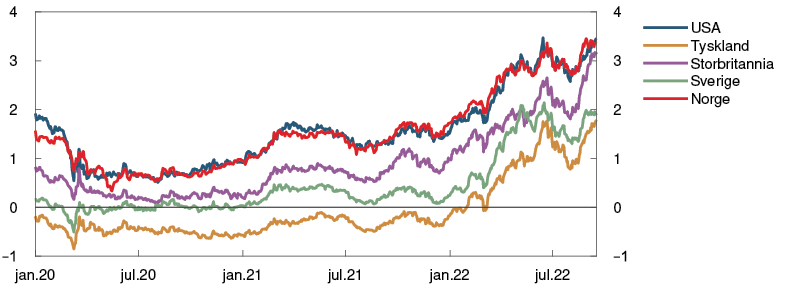 Det har vært store svingninger i internasjonale finansmarkeder siden forrige rapport. Videre oppgang i prisveksten har bidratt til at sentralbankene har strammet til pengepolitikken mer enn markedsaktørene så for seg i juni. Siden forrige rapport har sentralbankene i USA, euroområdet, Storbritannia og Sverige hevet sine styringsrenter. Samtidig har markedsaktørenes forventninger til styringsrentene hos våre viktigste handelspartnere det neste året steget videre. Langsiktige statsrenter er samlet sett lite endret siden juni, se figur 1.5.