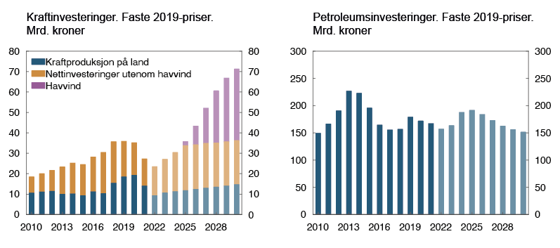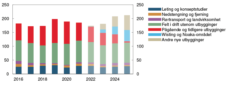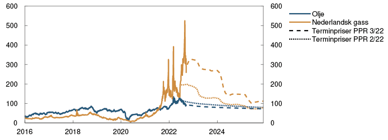 Prisen på olje har falt siden junirapporten og er nå rundt 90 dollar per fat, se figur 1.A. Nedgangen må ses i sammenheng med svakere utsikter for verdensøkonomien, se omtalen i kapittel 1. Russisk eksport av olje har samtidig blitt redusert mindre enn ventet. Frigivelse av strategiske oljelagre fra flere land gjennom sommeren har økt tilbudet av olje. På den annen side kan de høye gassprisene føre til økt etterspørsel etter olje. Dessuten besluttet OPEC-pluss i begynnelsen av september å redusere produksjonen igjen. EUs sanksjoner mot russisk olje iverksettes for fullt i begynnelsen av 2023. OPECs ledige produksjonskapasitet er liten, og oljelagrene i OECD-landene er lave. Fremtidsprisene indikerer likevel lavere oljepris de kommende årene. Fremtidsprisene for 2025 er rundt 75 dollar per fat, som er rundt 10 prosent lavere enn de var ved forrige rapport, se tabell 1.A.