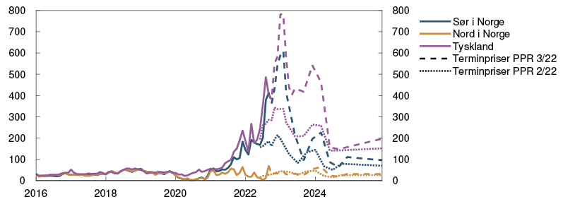 Kraftprisen sør i Norge er nå rundt 400 øre/kWh, se figur 1.B.3 Det er klart høyere enn i junirapporten. Oppgangen skyldes historisk lav fyllingsgrad i vannmagasinene på Sør- og Østlandet og oppgang i kraftprisene på kontinentet. Høye kraftpriser på kontinentet gjenspeiler høye priser for gass, kull og utslippskvoter samt sommerens værforhold. Stort bortfall av kjernekraft i Frankrike har også spilt inn. Prisen nord i Norge er lavere som følge av høy fyllingsgrad i vannmagasinene og begrenset overføringskapasitet i kraftkabler sørover. Fremtidsprisene for de enkelte prisregionene i Norge indikerer at kraftprisen sør i Norge ventes å være markert høyere de kommende årene enn hva som ble lagt til grunn i juni, mens prisen nord i Norge kan forbli relativt lav.