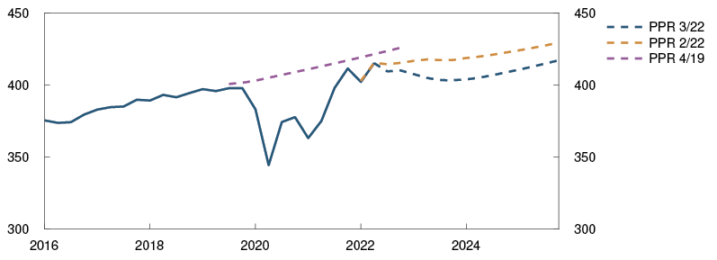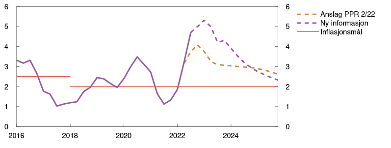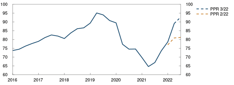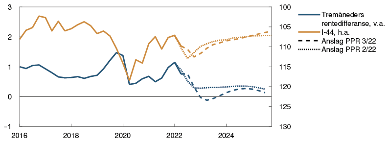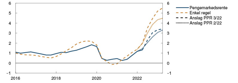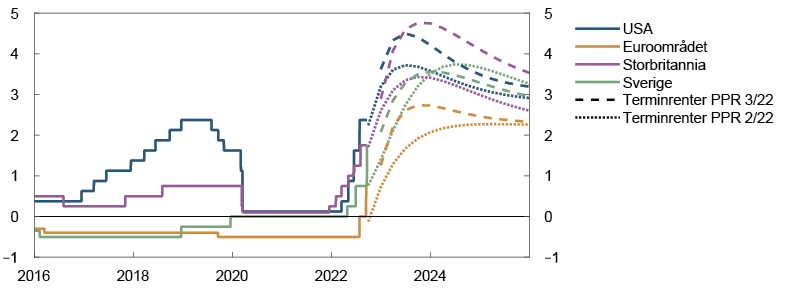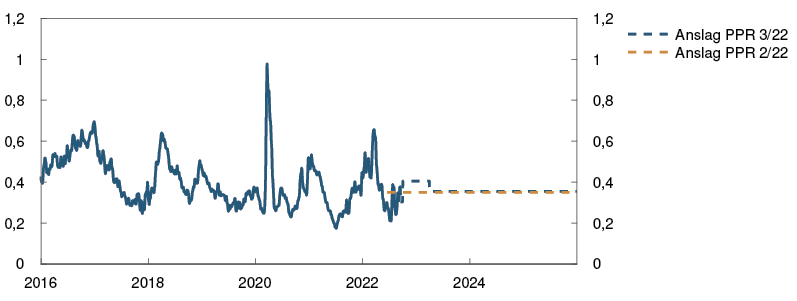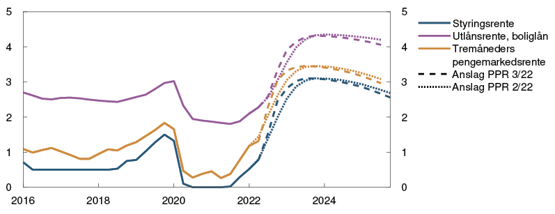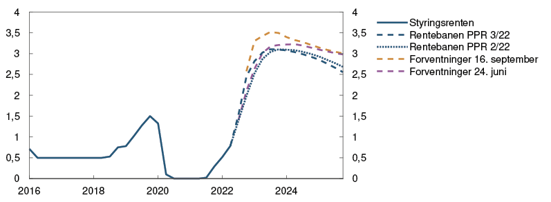 2 Periode: 1. januar 2016 – 31. desember 2025. Dagstall til og med 16. september 2022. Kvartalstall fra 3. kv. 2022 for PPR 2/22 og 4. kv. 2022 for PPR 3/22. Terminrenter per 17. juni 2022 for PPR 2/22 og 20. september 2022 for PPR 3/22. For euroområdet vises ESBs innskuddsrente.