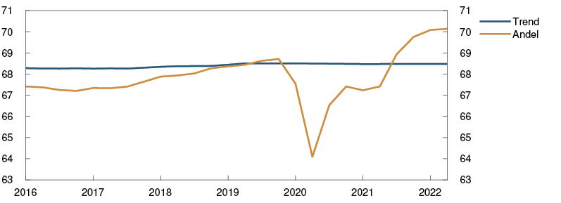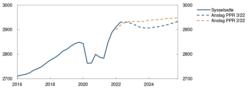 Arbeidsmarkedet er stramt. Sysselsettingen har fortsatt å stige, og arbeidsledigheten er svært lav. Den sesongjusterte registrerte ledigheten var 1,6 prosent i august, som anslått i forrige rapport. Den høye sysselsettingen gjenspeiler at det er færre ledige, men også at flere deltar i arbeidsmarkedet. Et høyt antall ubesatte stillinger viser at det fortsatt er høy etterspørsel etter arbeidskraft. Samtidig kan det se ut til at knappheten på arbeidskraft er i ferd med å avta. En høy andel av bedriftene i vårt regionale nettverk rapporterte i august at knapphet på arbeidskraft begrenset produksjonen, men andelen var litt lavere enn i forrige intervjurunde.
