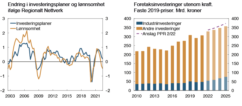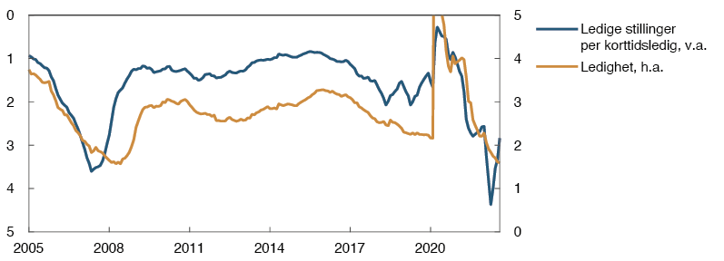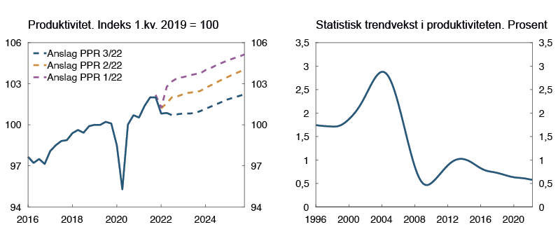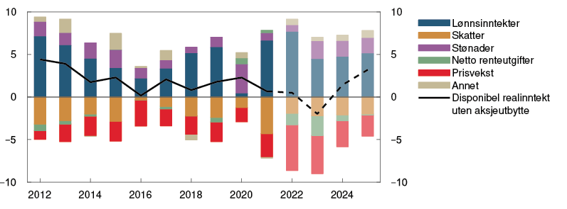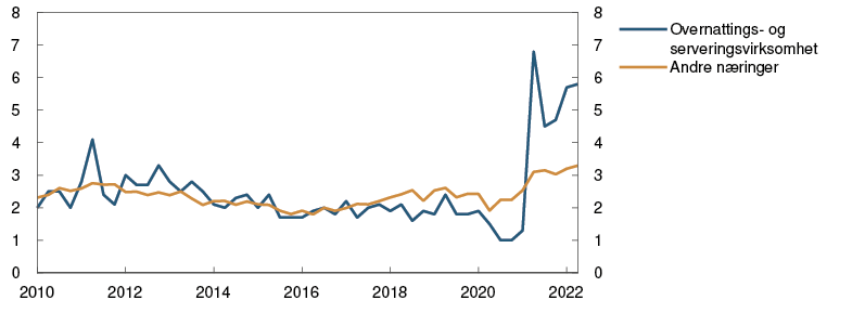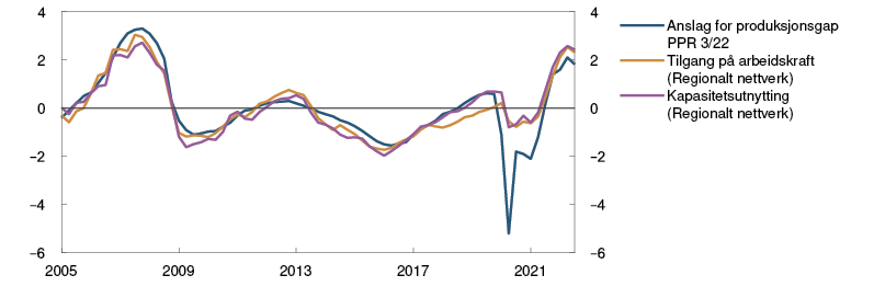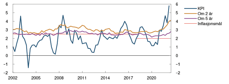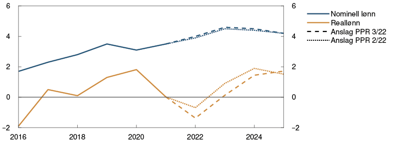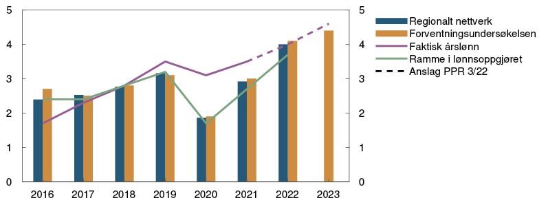 Tilstrammingen i arbeidsmarkedet har bidratt til at lønnsveksten har tatt seg gradvis opp de siste par årene. Årslønnsveksten i fjor ble 3,5 prosent. Forventningsundersøkelser tyder på at lønnsveksten i år blir høyere enn anslått i forrige rapport. Årslønnsveksten for 2022 anslås nå til om lag 4 prosent. Norges Banks forventningsundersøkelse viser at forventningene til lønnsveksten i 2023 også har økt siden forrige rapport.