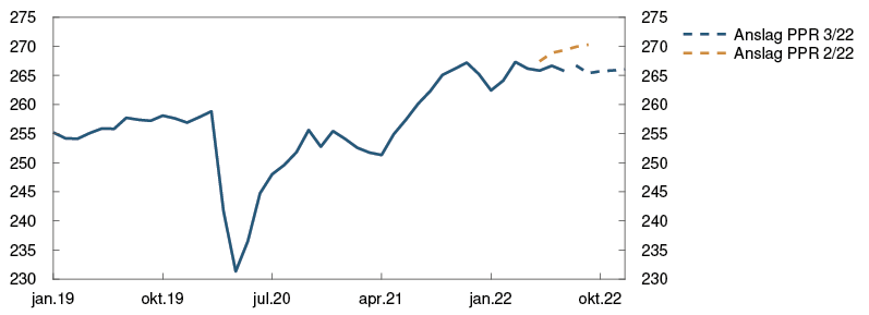 Arbeidsmarkedene er stramme i mange land. I euroområdet og Sverige er arbeidsledigheten lavere enn før pandemien. Lønnsveksten hos våre viktigste handelspartnere anslås å holde seg over 4 prosent både i år og neste år. Deretter venter vi at lønnsveksten gradvis vil avta. Langsiktige markedsbaserte inflasjonsforventninger er lite endret siden junirapporten og ligger nær inflasjonsmålene både i USA og euroområdet. Vi venter at den underliggende konsumprisveksten i år blir rundt 6 prosent i USA og nær 4 prosent i euroområdet. Vi anslår at den underliggende prisveksten for handelspartnerne samlet vil avta fra 4,6 prosent i år til 3,6 prosent i 2023 og deretter gradvis reduseres til rundt 2 prosent. Anslagene for 2022 og 2023 er oppjustert fra junirapporten.