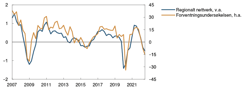 Bedriftene i Regionalt nettverk har nedjustert sine forventninger til veksten i produksjonen fremover og venter samlet sett en liten nedgang det neste halve året. Bedriftene venter at sterk pris- og kostnadsvekst og høyere rente vil dempe etterspørselen fremover, særlig fra husholdningene og oppdragsgiverne i bygg- og anleggsnæringen.
