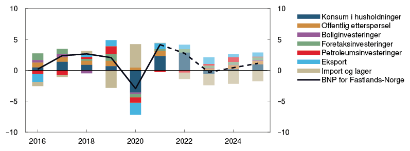 Vi legger til grunn at pengepolitikken strammes til i tråd med markedets renteforventninger og at råvareprisene utvikler seg i tråd med fremtidsprisene. Økte forsvars- og energiinvesteringer i Europa vil trolig løfte aktiviteten utover i prognoseperioden. I Kina venter vi at veksten fremover blir lavere enn i årene før pandemien som følge av politikktiltak for å sikre en mer balansert vekst, med lavere kredittvekst og høyere innenlandsk etterspørsel. Vi anslår at BNP-veksten hos handelspartnerne avtar fra rundt 3 prosent i 2022 til om lag 1 prosent i 2023, før den tar seg opp igjen i 2024, se tabell 1 i vedlegget. Importen til handelspartnerne anslås å øke med nær 7 prosent i 2022 og om lag 1 prosent i 2023.
