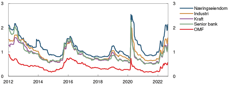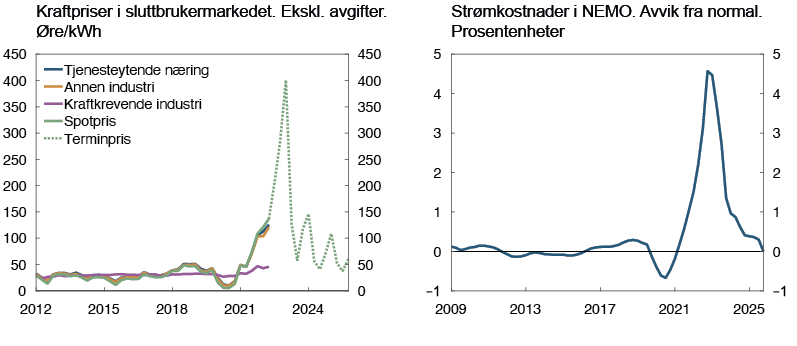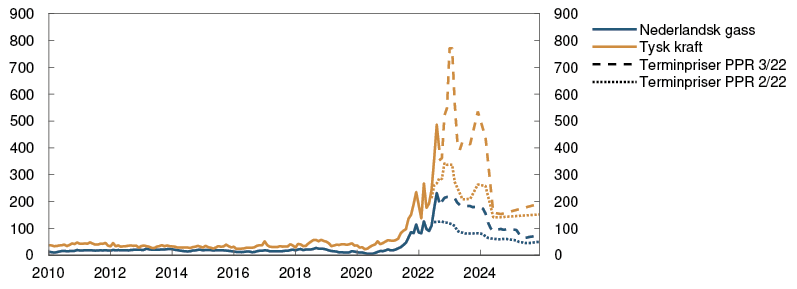 Siden junirapporten har gass- og kraftprisene i Europa steget markert, se figur 1.1 og «Svært høye priser på gass og kraft». Fra slutten av august har det vært tilnærmet full stans i gassleveransene fra Russland til resten av Europa. For de neste årene legger vi til grunn at gass- og kraftprisene vil holde seg høye, i tråd med fremtidsprisene. Det er vanskelig å anslå de økonomiske konsekvensene av utviklingen i gass- og kraftmarkedene. Prisutviklingen vil trolig føre til at flere bedrifter i Europa ser seg nødt til å nedskalere virksomheten på grunn av høye energikostnader. Mange bedrifter søker trolig å redusere energibehovet i produksjonen eller finne andre energikilder, men en slik omstilling vil ta tid. I flere land får husholdningene økonomisk støtte fra myndighetene, men utgiftene til energi vil likevel være svært høye de nærmeste kvartalene.