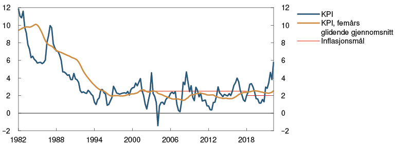 Også den underliggende prisveksten har økt. Tolvmånedersveksten i konsumprisindeksen justert for avgiftsendringer og uten energivarer (KPI-JAE) steg til 4,7 prosent i august, som var mye høyere enn anslått. Det er særlig prisene på matvarer som har trukket opp prisveksten i sommer, men også prisene på en rekke andre varer og tjenester har steget mer enn normalt. Det er høy vekst i prisene både på varene vi importerer og på norskproduserte varer og tjenester. Andre indikatorer for den underliggende prisveksten har også steget. Fremover vil den høye veksten i energiprisene trolig bidra til å løfte prisene på varer og tjenester ytterligere.