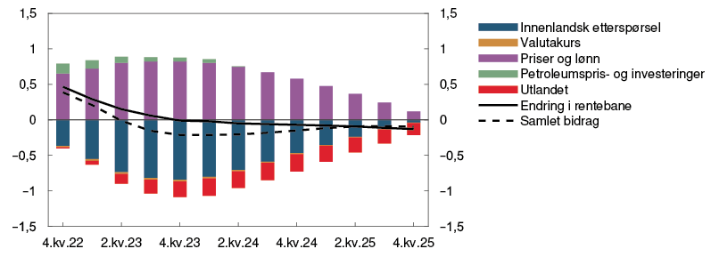 Det siste året er styringsrenten blitt økt fra et svært lavt nivå, og pengepolitikken begynner nå å virke innstrammende på norsk økonomi. Det kan tilsi å gå mer gradvis frem i rentesettingen fremover. I denne rapporten er det lagt til grunn at styringsrenten økes til rundt 3 prosent i løpet av vinteren. Inflasjonen anslås å avta og nærme seg målet på noe sikt. Kapasitetsutnyttingen ventes å avta, for så å holde seg litt under et normalt nivå de neste årene. Arbeidsledigheten vil da øke noe, men fra et lavt nivå.