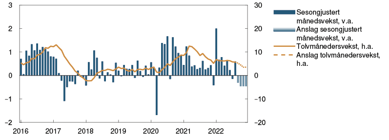 Aktiviteten i norsk økonomi er høy, men det er nå klare tegn til at økonomien er i ferd med å kjøle seg ned. Etter en periode med sterk vekst avtok BNP for Fastlands-Norge noe utover våren og sommeren og var i juli lavere enn anslått i forrige rapport. Høy prisvekst har dempet husholdningenes kjøpekraft, og veksten i konsumet avtok mer enn ventet i sommer. Korttransaksjonsdata indikerer at vare- og tjenestekonsumet falt i august. Husholdningene sparer nå mindre av inntektene sine, men har samlet sett fortsatt mye oppsparte midler etter pandemien. Det har vært høy omsetning i bruktboligmarkedet, og boligprisene har steget mer enn anslått. Salget av nye boliger har falt til et lavt nivå.