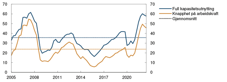4 Periode: 1. kv. 2005 – 3. kv. 2022. Andel av kontaktene som vil ha noen eller betydelige problemer med å møte vekst i etterspørselen og andel av kontaktene som svarer at knapphet på arbeidskraft begrenser produksjonen. Spørsmålet om arbeidskraft er bare stilt til de bedriftene som har oppgitt å ha full kapasitetsutnytting, men serien viser andelen av alle kontaktene i intervjurunden. Kommune- og sykehussektoren svarer ikke på spørsmålet om kapasitetsutnytting, men svarer på spørsmålet om arbeidskraft.