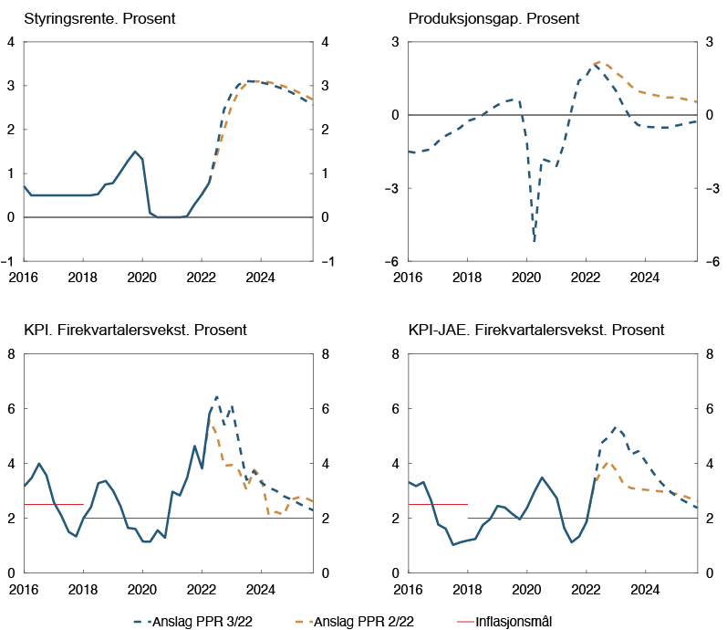 6 Periode: 1. kv. 2016 – 4. kv. 2025. Anslag fra 2. kv. 2022 for PPR 2/22 og 3. kv. 2022 for PPR 3/22 for styringsrente, KPI og KPI-JAE. Produksjonsgapet måler den prosentvise forskjellen mellom BNP for Fastlands-Norge og anslått potensielt BNP for Fastlands-Norge. KPI-JAE: KPI justert for avgiftsendringer og uten energivarer.
