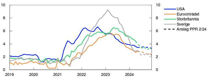 Siden toppen i slutten av 2022 har samlet konsumprisvekst falt betydelig hos alle våre viktigste handelspartnere. Siden slutten av 2023 har den vært lite endret og var i mai rundt 2,5 prosent i euroområdet og Sverige og litt over 3 prosent i USA.