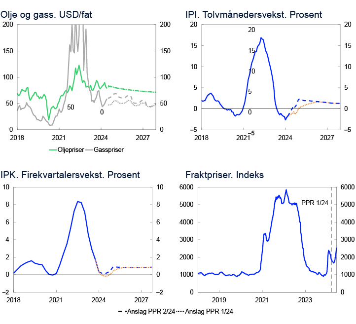 Prisene på gass, utslippskvoter og kraft på kontinentet har økt siden mars, mens oljeprisen er lite endret. Siden toppen i 2022 har disse energiprisene falt mye, men de ser ut til å holde seg høye sammenliknet med tiårsperioden før pandemien. Veksten i våre indekser for priser på importerte innsats- og konsumvarer til Norge er lav. Anslagene for den videre veksten er oppjustert siden forrige rapport, og gjenspeiler blant annet økte fremtidspriser på enkelte råvarer.