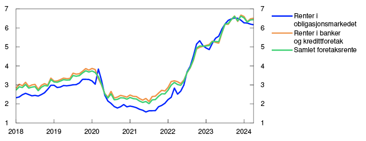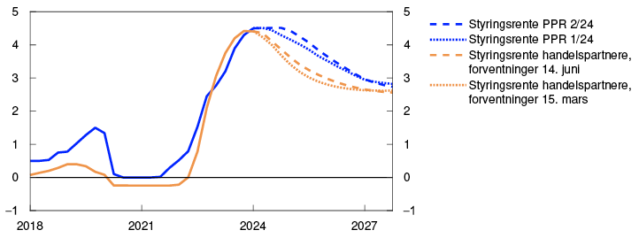 Styringsrenteforventningene i markedet indikerer at første rentekutt i USA og Storbritannia kommer til høsten. Sammenlignet med forrige rapport er forventningene i markedet at rentekuttene fra sentralbankene kommer senere, se figur 1.4. Det må sees i lys av at markedsaktørene trolig legger til grunn at det vil ta noe lenger tid å få inflasjonen ned til målet. Langsiktige statsrenter hos handelspartnerne er lite endret siden mars.