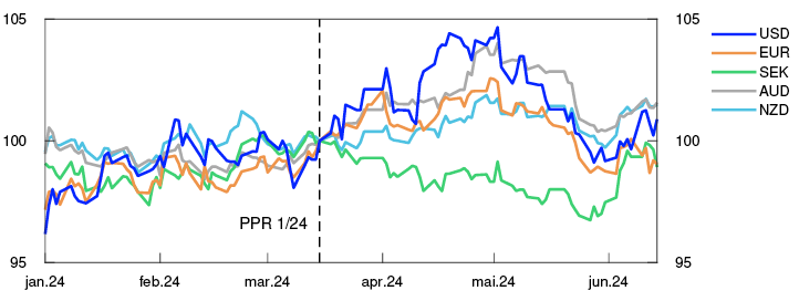 Siden forrige rapport har sentralbankene i Sverige og euroområdet kuttet styringsrenten. Sentralbankene i USA og Storbritannia har holdt renten i ro. Sammenlignet med i mars, venter markedsaktørene færre rentekutt fra sentralbankene i år. Rentene på langsiktige statsobligasjoner hos våre viktigste handelspartnere er lite endret.