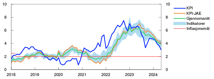 Prisveksten har avtatt videre siden forrige rapport. I mai var den samlede konsumprisveksten (KPI) 3,0 prosent, som var noe lavere enn anslått. Tolvmånedersveksten i konsumprisindeksen justert for avgiftsendringer og uten energivarer (KPI-JAE) var 4,1 prosent i mai. Det var om lag som ventet.