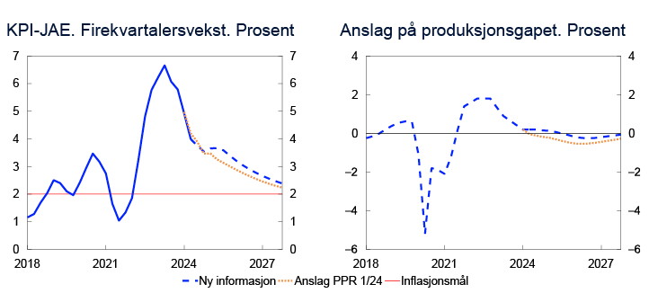 Presset i norsk økonomi har avtatt gradvis siden begynnelsen av 2023. I starten av 2024 var kapasitetsutnyttingen samlet sett trolig nær et normalt nivå, og den ser ut til å ha holdt seg om lag uendret den siste tiden. Den registrerte arbeidsledigheten har økt litt de siste par årene, men er fortsatt lav. Oppgangen i ledigheten har blant annet sammenheng med at mange ukrainske flyktninger har meldt seg som ledige hos NAV. I mai var den registrerte ledigheten 2 prosent, som anslått. Sysselsettingen steg videre i første kvartal og var litt høyere enn ventet. Bedriftene i vårt regionale nettverk melder at kapasitetsutnyttingen har økt litt i andre kvartal, men at den fortsatt er lavere enn normalt. Bedriftene venter at sysselsettingen vil øke videre, og ifølge NAV har antallet nye ledige stillinger fortsatt å øke. Samlet sett ser det ut til at kapasitetsutnyttingen i økonomien er noe høyere enn anslått.