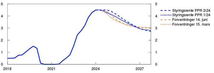 Styringsrenteforventningene her hjemme har steget litt. Markedsprisingen indikerer forventninger om at renten vil settes ned mot slutten av året. Kronen er litt sterkere enn i mars og har den siste tiden vært om lag som anslått.