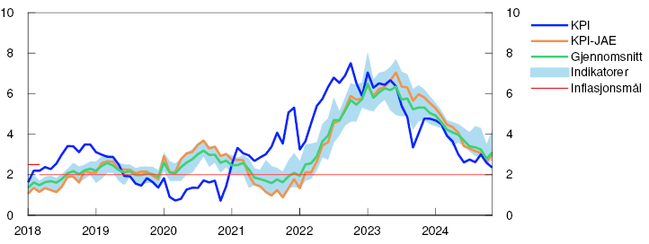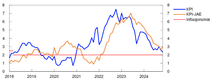 Prisveksten har avtatt videre siden forrige rapport. Tolvmånedersveksten i konsumprisindeksen (KPI) falt til 2,4 prosent i november. Veksten i KPI justert for avgiftsendringer og uten energivarer (KPI-JAE) økte til 3,0 prosent, som anslått. Gjennomsnittet av andre indikatorer for underliggende inflasjon økte også i november, til om lag 3 prosent.