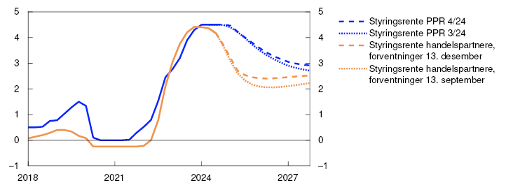 I lys av lavere prisvekst begynte sentralbankene hos våre viktigste handelspartnere å sette ned styringsrentene tidligere i år. For handelspartnerne samlet sett er styringsrenteforventningene litt høyere enn i september. Markedsaktørene venter færre rentekutt fra sentralbanken i USA fremover, mens det ventes at den europeiske sentralbanken vil sette ned renten litt raskere.