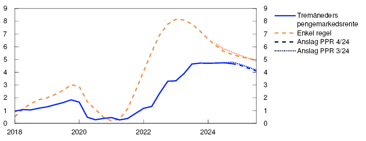Prognosen i denne rapporten indikerer en styringsrente som settes gradvis ned fra første kvartal 2025. Sammenliknet med forrige rapport er prognosen for styringsrenten lite endret, men den indikerer noe mindre nedgang i renten i årene fremover. Arbeidsledigheten vil trolig øke litt, men litt mindre enn anslått i forrige rapport. Inflasjonen anslås å være i overkant av 2 prosent i slutten av 2027.
