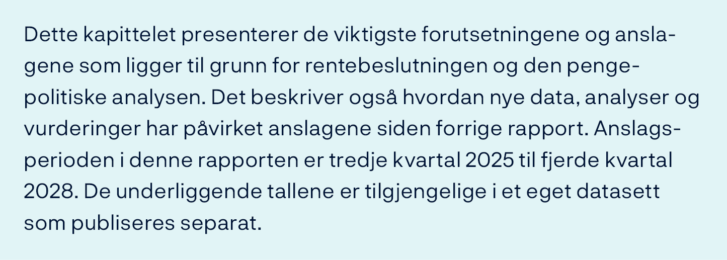 En forsiktig normalisering av styringsrenten vil legge til rette for at prisveksten etter hvert kommer tilbake til målet uten at arbeidsledigheten øker mye. Prognosen for styringsrenten i denne rapporten avtar gradvis til noe over 3 prosent mot slutten av 2028. Prognosen er noe oppjustert fra forrige rapport. Den registrerte arbeidsledigheten vil trolig øke litt. Med en gradvis nedgang i lønnsveksten fremover anslås prisveksten å avta og være nær 2 prosent i 2028.
