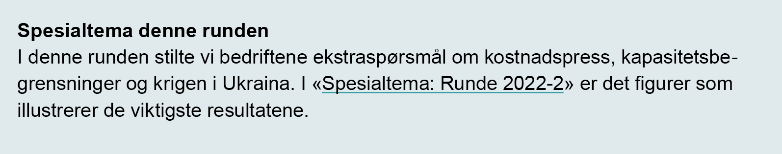 Mange bedrifter påvirkes av at vareflyten i økonomien ikke er så god som før. Nær seks av ti bedrifter svarer at tilgangen på innsatsvarer er dårligere enn ved årskiftet, mens knappe 5 prosent svarer at den har blitt bedre (se figur 2 i spesialtema). Om lag en tredjedel av bedriftene tror mangel på innsatsvarer vil ha en dempende effekt på omsetningsvolumet det neste halvåret (se figur 4 i spesialtema). Andelen er spesielt høy for bedriftene i bygg- og anleggsnæringen og i industrien. Krigen i Ukraina ser ut til å forsterke både logistikkutfordringene og varemangelen, og om lag halvparten av alle bedriftene oppgir at krigen i Ukraina har ført til vanskeligere tilgang på varer (se figur 7 i spesialtema).