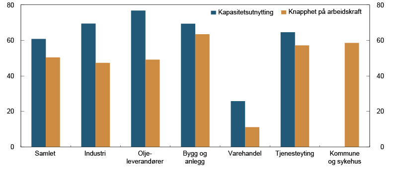 2 Andel av kontaktene som svarer at knapphet på arbeidskraft begrenser produksjonen/salget. Spørsmålet om arbeidskraft er bare stilt til de bedriftene som har oppgitt å ha full kapasitetsutnytting, men serien viser andelen av alle som er med i intervjurunden. Kommune- og sykehussektoren svarer ikke på spørsmålene om kapasitetsutnytting, men svarer likevel på spørsmålet om arbeidskraft.
