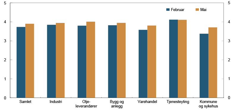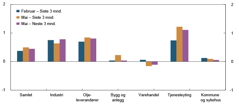 Bedriftene har ansatt færre enn planlagt de siste tre månedene. Mangelen på egnet arbeidskraft demper oppbemanningen i mange av bedriftene. Bedriftene har likevel ansatt flere i løpet av våren enn gjennom vinteren, og de ser for seg at sysselsettingen vil øke med om lag samme takt utover sommeren (se figur 3). Utfordringene med å finne egnet arbeidskraft er aller størst blant bedriftene som bruker mye utenlandsk arbeidskraft. Problemene er mest utbredt blant bygg- og anleggsbedriftene og tjenesteyterne, i tillegg til kommunene og sykehusene (se figur 2). Det er knapphet innenfor et bredt spekter av fagområder, for eksempel kokker, sjåfører, håndverkere og helsearbeiedere. Mangelen på ingeniører og it-kompetanse er også blitt enda større. Mer enn 40 prosent av bedriftene opplever at tilgangen på arbeidskraft har blitt dårligere siden starten av året, mens kun et fåtall opplever at tilgangen har blitt bedre (se figur 3 i spesialtema).